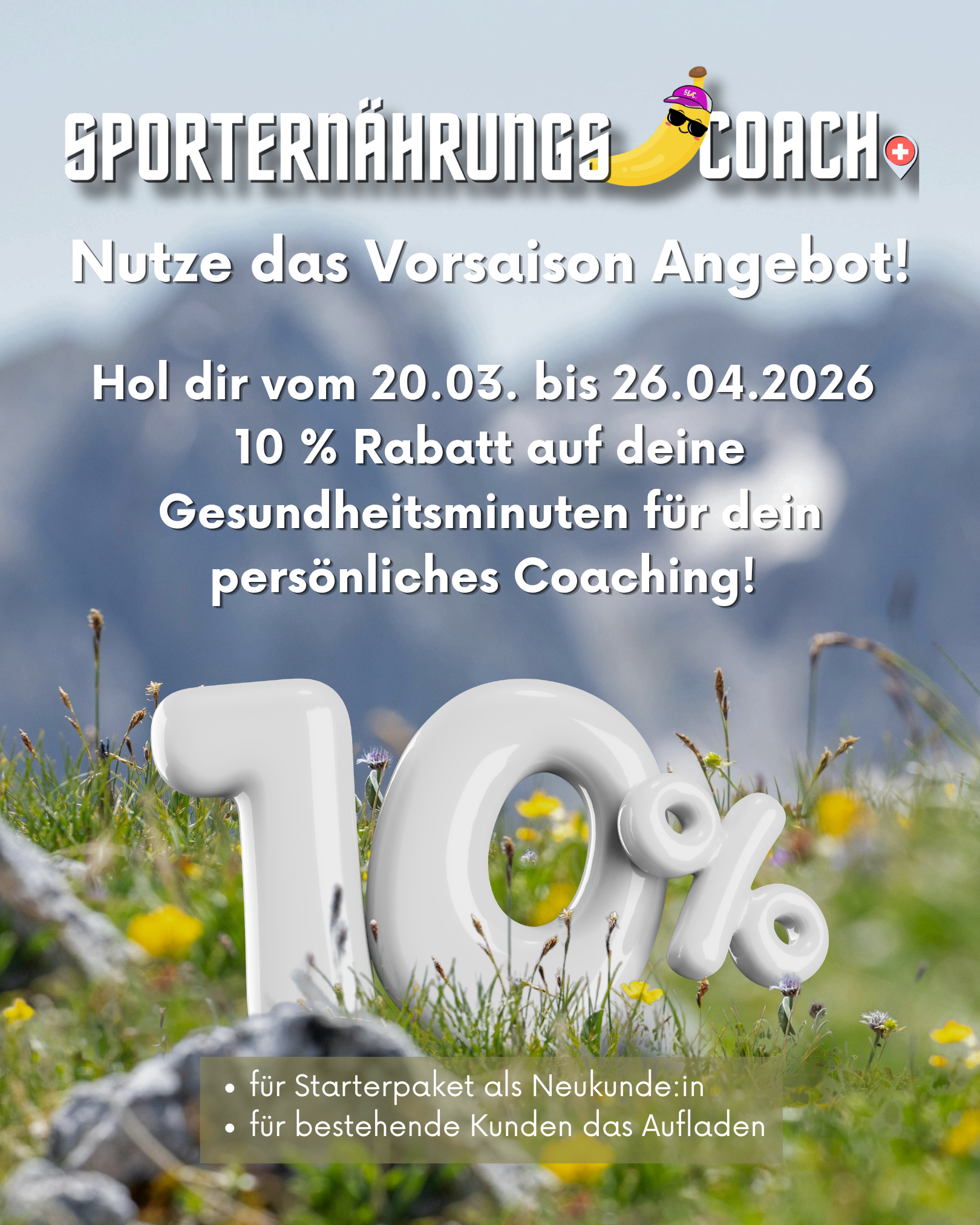 Das Vorsaison Angebot ist ideal, wenn du im Frühling mit neuer Energie, besserer Ernährung und klaren Zielen starten willst. Vom 20. März bis 26. April 2026 erhältst du 10 % Rabatt auf deine Gesundheitsminuten, wenn du mit deinem Coaching beginnst oder bestehende Minuten auflädst. Ich begleite dich persönlich – für Ernährung, mentale Stärke, Energieaufbau und Gesundheit im Alltag oder im Sport.